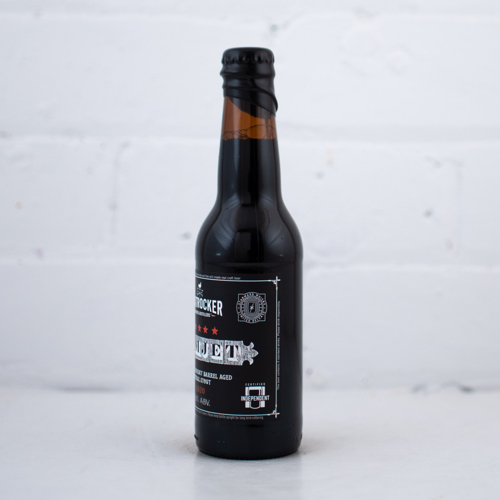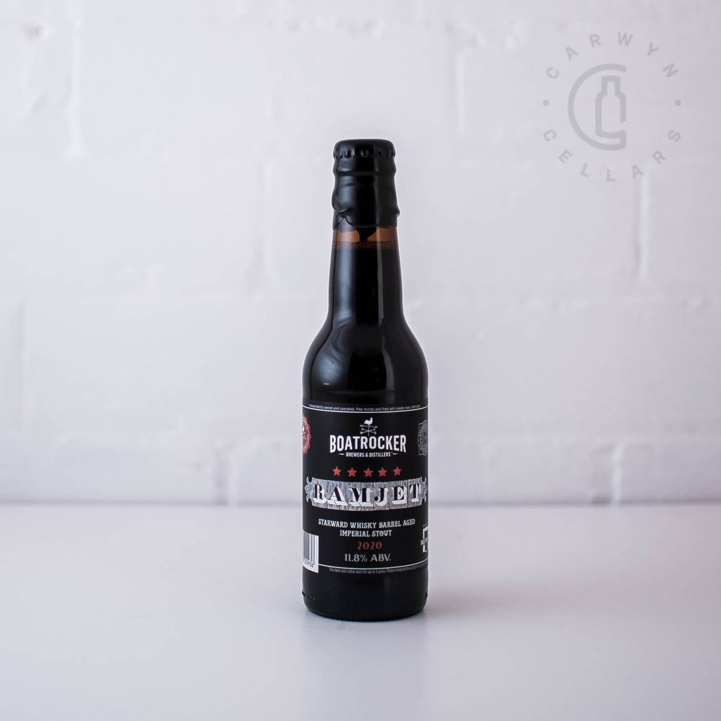 "Aged in freshly emptied whisky barrels from our friends at Starward Whisky Distillery in Port Melbourne, Ramjet 2020 is a big beer with great malt complexity. Our 2020 vintage of Ramjet is a mix of barrels from the always incredible Starward whisky… Some American oak, some French. The result? Layers of complexity, with perhaps a touch more vanilla on the palate (not quite as much as Roger Ramjet though), with the red wine notes that were previously in the Starward barrels making its presence known. The whisky is prominent as usual, giving way to the rich malts, complex oak character and light fruit and roast malt finish. Stored upright in a cool, dark place, Ramjet 2020 will reward careful cellaring of at least 5 years. Over time, the whisky will become less prominent and the barrel type more pronounced–the end result being just sublime" - Boatrocker