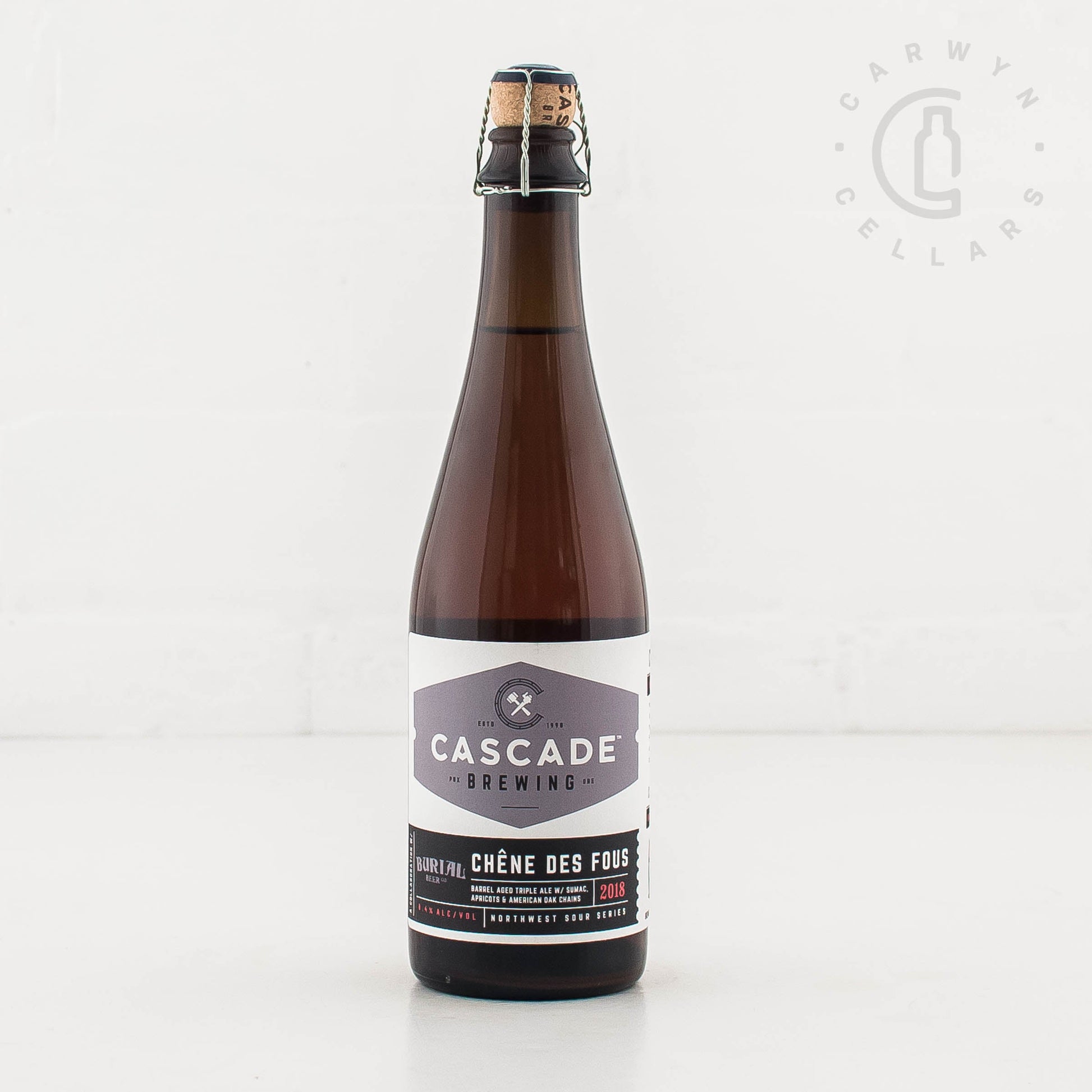 Made in collaboration with our friends at Burial Beer Company in Ashville, NC, Chene des Fous (shen de-FOO), meaning 'Oak of the Fools,' is a blend of sour triple ales aged for up to 18 months in French oak barrels with dried sumac, fresh apricots and toasted American oak chains. Intense oak flavors are met with lemon and dried fruit notes from the sumac and a subtle stone fruit aroma.
