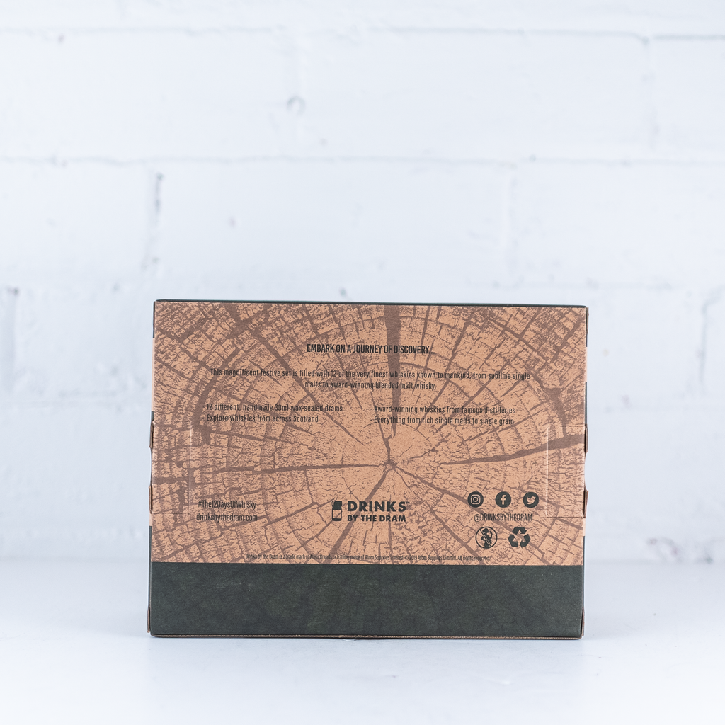 12 different, handmade 30ml wax-sealed drams. Explore whiskies from across Scotland. Award winning whiskies from famous distilleries. Everything from rich single malts to single grain." - Drinks by the Dram
