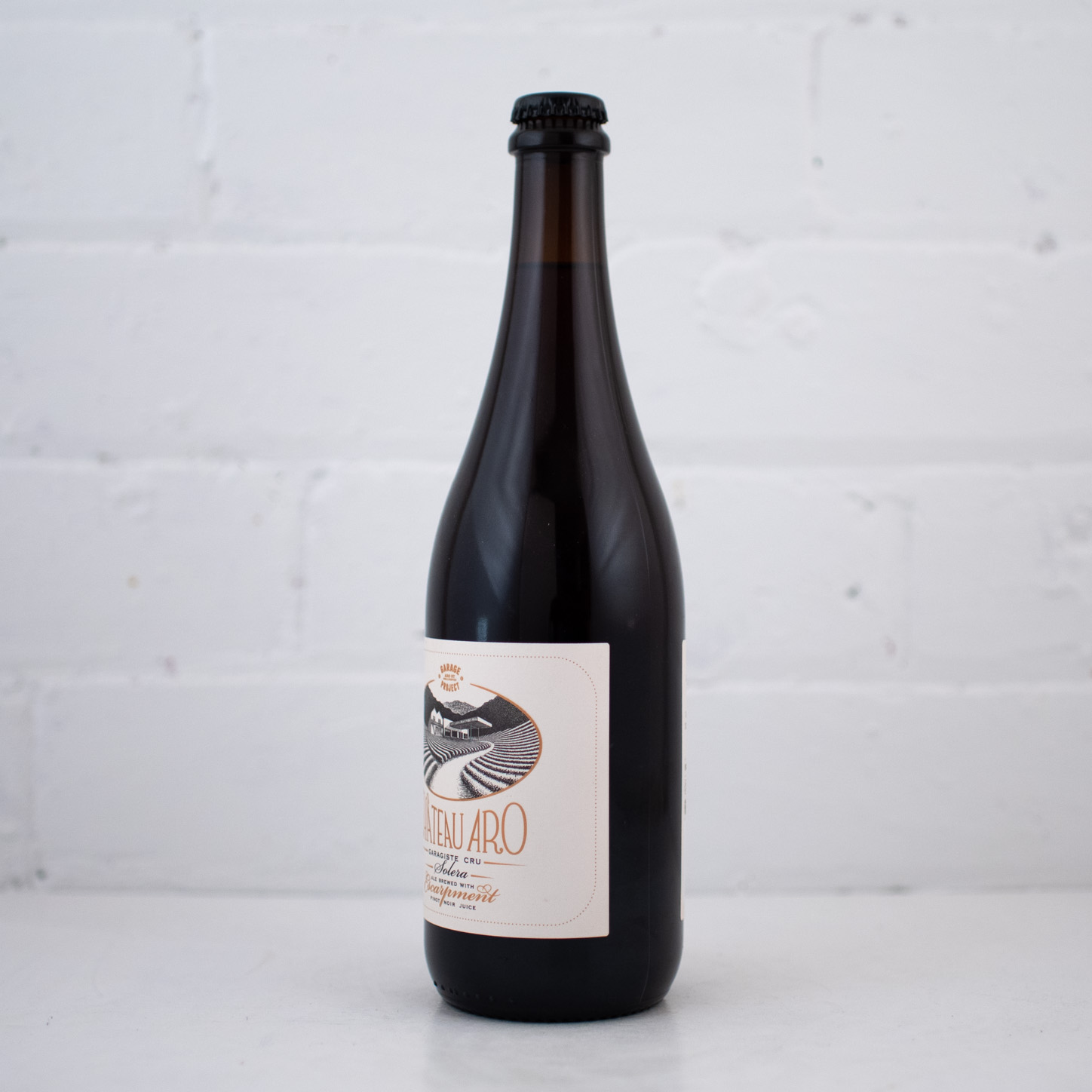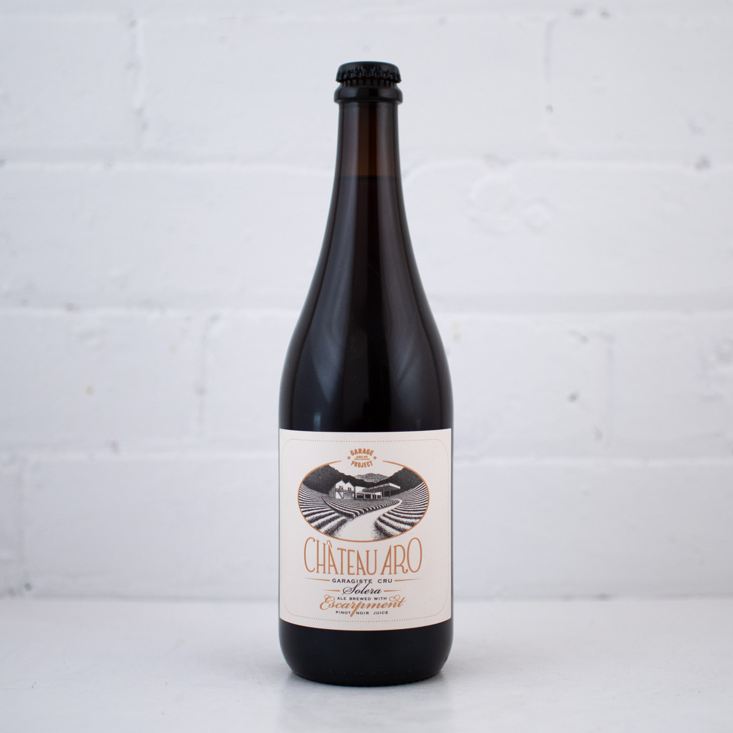 "Château Aro, a dark rubescent ale, conditioned on freshly crushed pinot noir juice and skins, then aged in French oak barrels - all from award winning Escarpment Winery. This very special ‘solera’ release blends together 2015, 2016, 2017 and 2018 vintages, creating a beer of near unparalleled complexity and depth." - Garage Project, Wellington NZ