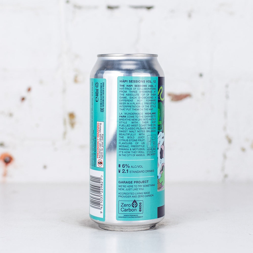 "The H?pi Sessions 2023, a hat-trick of collaborations from three breweries at the absolute top of their game, each showcasing a different hop forward beer in a playful ‘freestyle’ interpretation of the style that put them on the map. LA wunderkinds Highland Park come to the Garage to breathe new life into an old style with their hop fuelled West Coast take on the classic pilsner. Mellow, sweet malt notes balance beautifully with the bold juicy citrus stone fruit flavours of US Mosaic, Freestyle Riwaka & Motueka. It’s how they roll in the City of Angels." - Garage Project