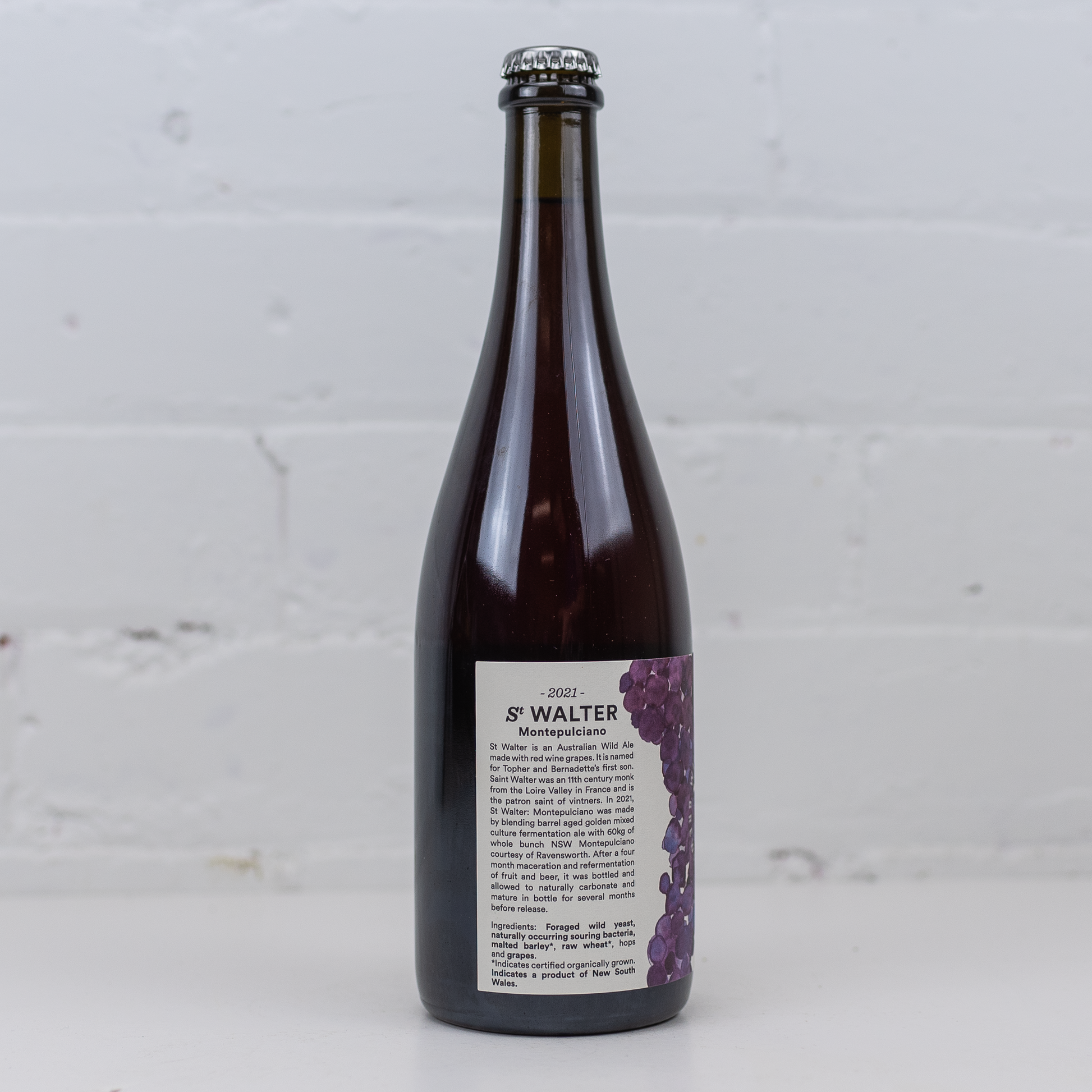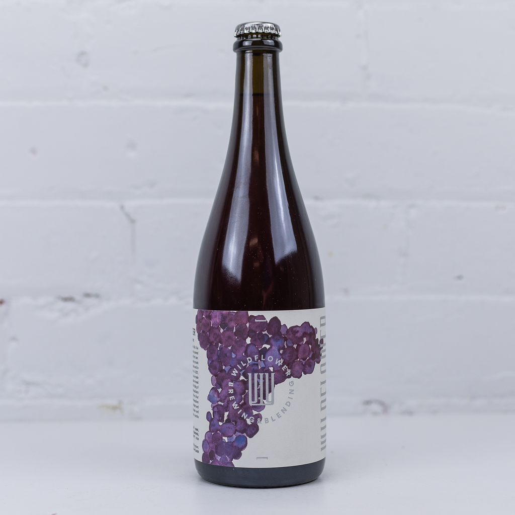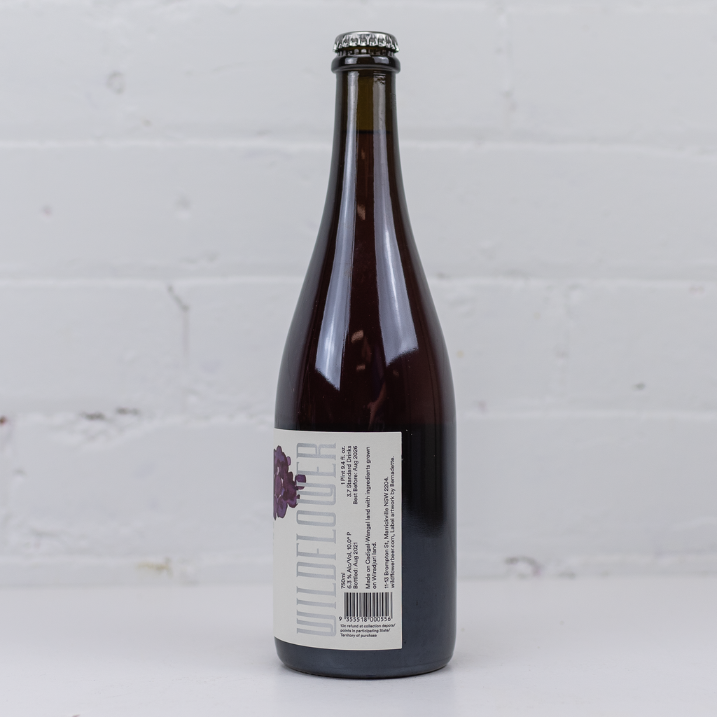 "St Walter 2021: Montepulciano was made by blending barrel aged golden mixed culture fermentation ale with 60kg of whole bunch NSW Montepulciano courtesy of Ravensworth. After a four month maceration and refermentation of fruit and beer, it was bottled and allowed to naturally carbonate and mature in bottle for several months before release." - Wildflower
